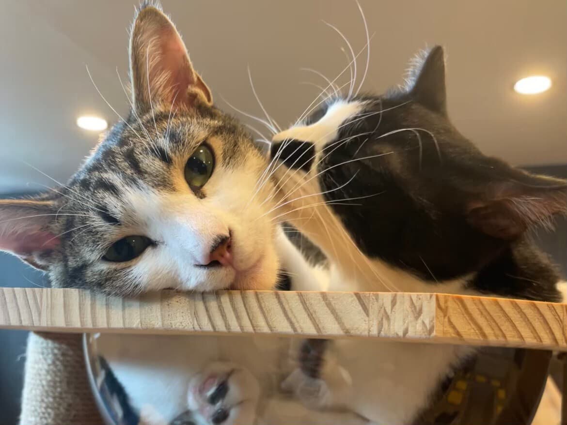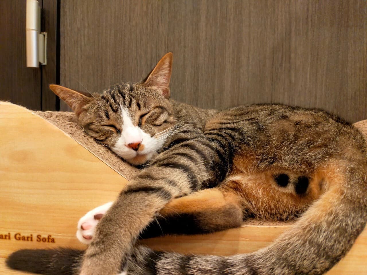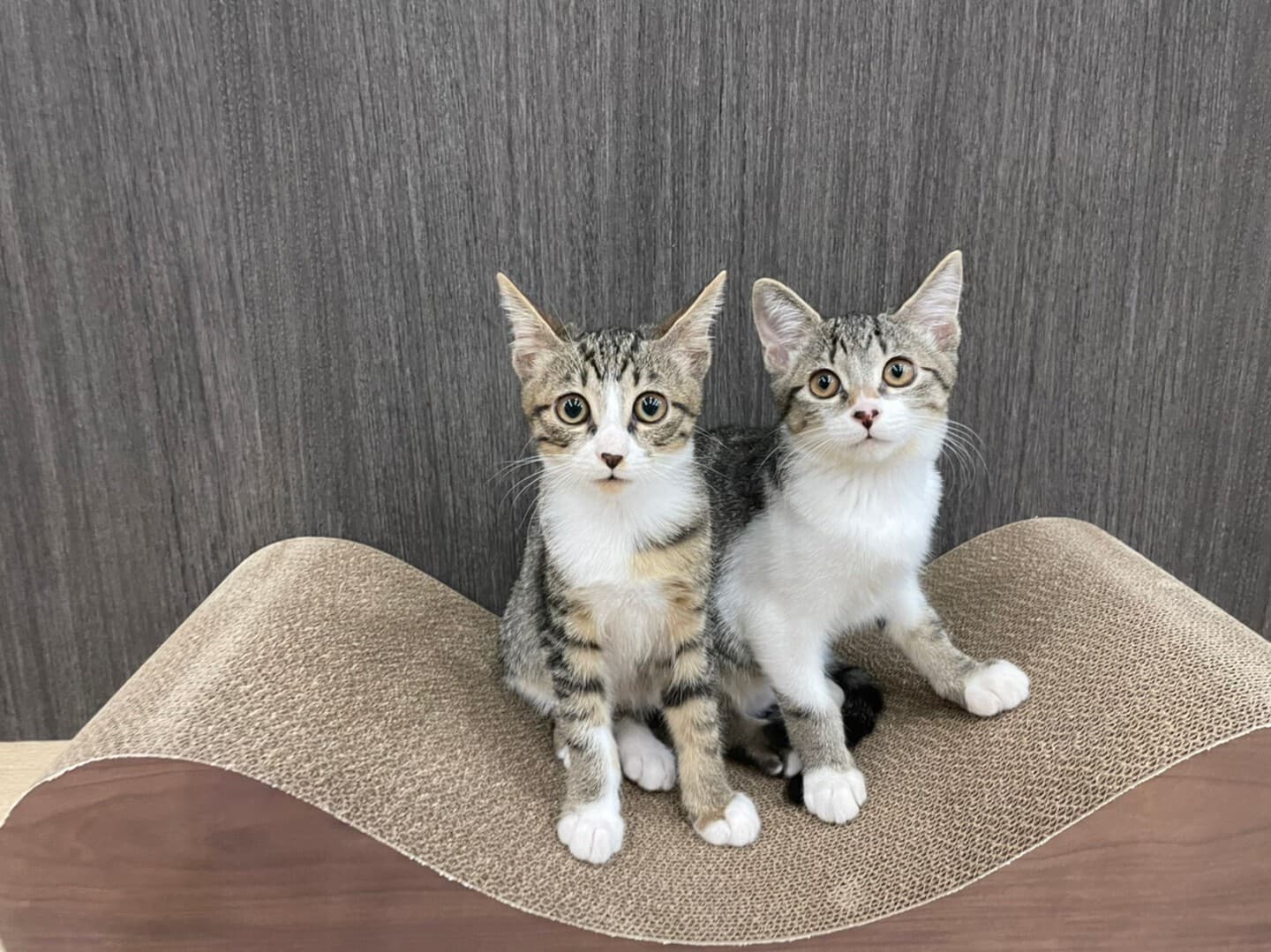 猫ちゃんは環境の変化が苦手です。保護初日とても緊張していて食事、おトイレを我慢してしまいます。また恐怖から暴れる子もいます。それらが落ち着くまで数日カウンターで管理します。その間に新しく来た子と先住猫ちゃんがお互いの存在を理解します。徐々に先住猫ちゃんと触れ合い、猫ちゃん同士が慣れたら、店内ケージに移動。お客様とケージ越しに慣れながらようやく店内にデビューします。感染症対策でデビューまでにワクチンも2回しっかりと打ちます。約1ヶ月〜2ヶ月を要します。